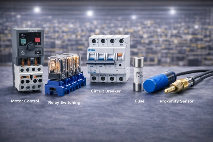 Circuit Breaker, Fuse, Proximity Sensor, Temperature Sensor, Relay, Contactor