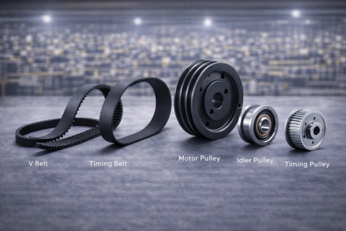 V Belts, Timing Belts, Flat Belts, Motor Pulley, Idler Pulley, Timing Pulley