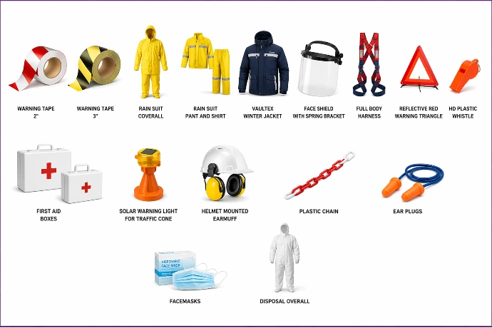 Warning Tapes, Rain Suites, Body Harness, Chains, Masks, First Aids & much more.