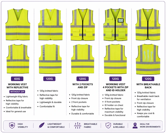 60g & 120g working Vests with & without Zip, Vests with & without pockets
